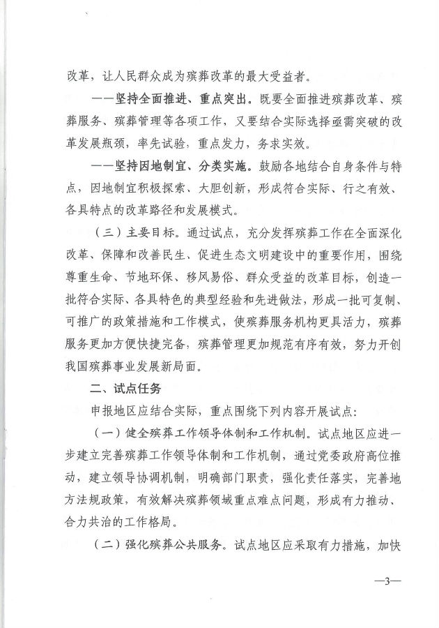 (三)主要目標。通過試點,充分發揮殯葬工作在全面深化改革、保障和改善民生、促進生態文明建設中的重要作用,圍繞尊重生命、節地環保、移風易俗、群眾受益的改革目標,創造一批符合實際、各具特色的典型經驗和先進做法,形成一批可復制、可推廣的政策措施和工作模式,使殯葬服務機構更具活力,殯葬服務更加方便快捷完備,殯葬管理更加規范有序有效,努力開創我國殯葬事業發展新局面。