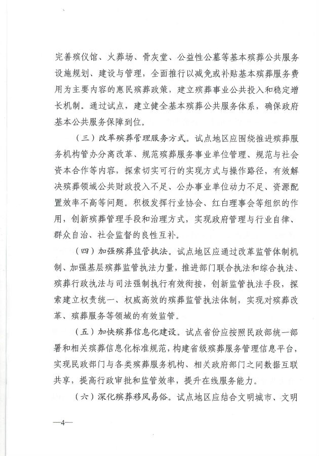 (三)改革殯葬管理服務方式。試點地區應圍繞推進殯葬服務機構管辦分離改革、規范殯葬服務事業單位管理、規范與社會資本合作等內容,探索切實可行的實現方式與操作路徑,有效解決殯葬領域公共財政投入不足、公辦事業單位動力不足、資源配置效率不高等問題。積極發揮行業協會、紅白理事會等組織的作用,創新殯葬管理手段和治理方式,實現政府管理與行業自律、群眾自治、社會監督的良性互補。