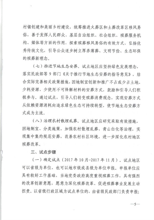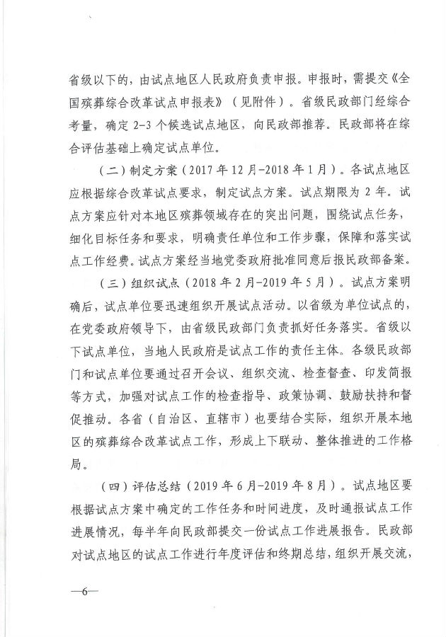 (一)確定試點(2017年10月-2017年11月)。試點地區可以省級為單位、也可以地市級或縣級為單位申報。申報單位應具有較好工作基礎,當地黨委政府高度重視殯葬工作,具有強烈的改革創新意愿,愿意為深化殯葬改革、促進殯葬事業發展主動擔責。以省級行政區域為試點單位的,由省級民政部門負責申報;省級以下的,由試點地區人民政府負責申報。申報時,需提交《全國殯葬綜合改革試點申報表》(見附件)。省級民政部門經綜合考量,確定2-3個候選試點地區,向民政部推薦。民政部將在綜合評估基礎上確定試點單位。