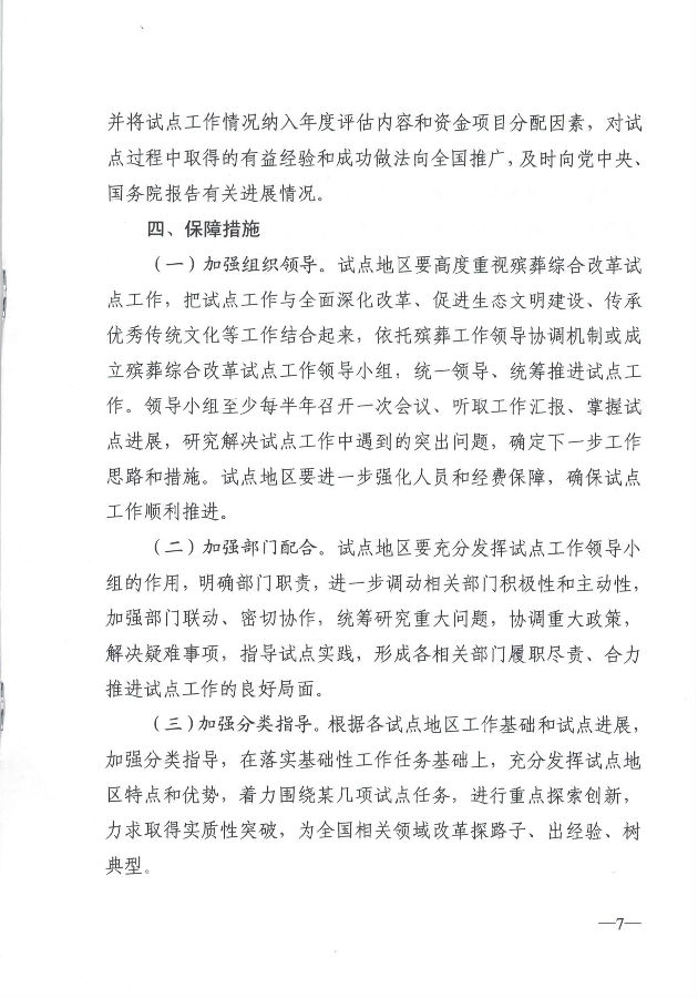(一)健全殯葬工作領導體制和工作機制。試點地區應進一步建立完善殯葬工作領導體制和工作機制,通過黨委政府高位推動,建立領導協調機制,明確部門職責,強化責任落實,完善地方法規政策,有效解決殯葬領域重點難點問題,形成有力推動、合力共治的工作格局。
